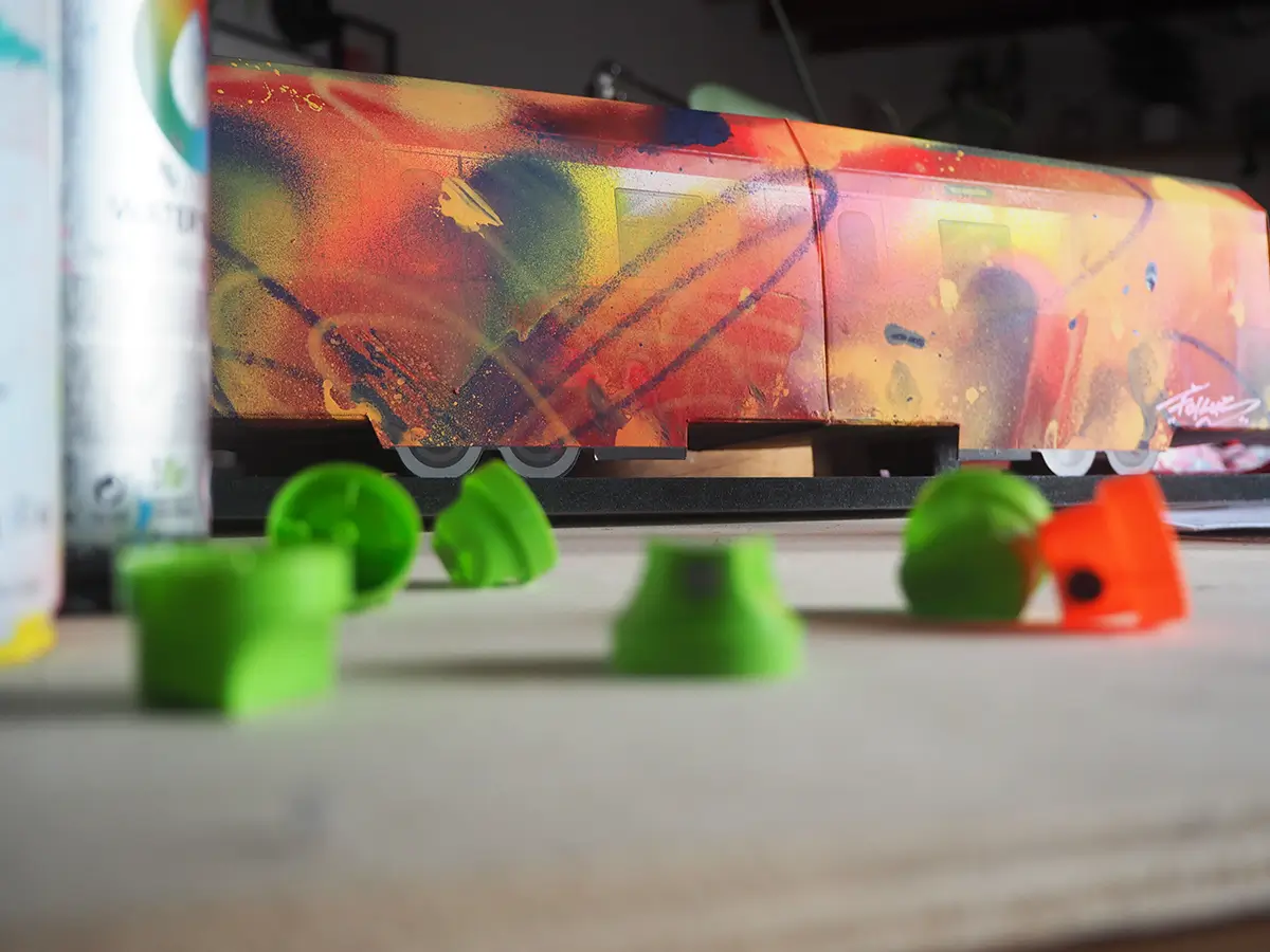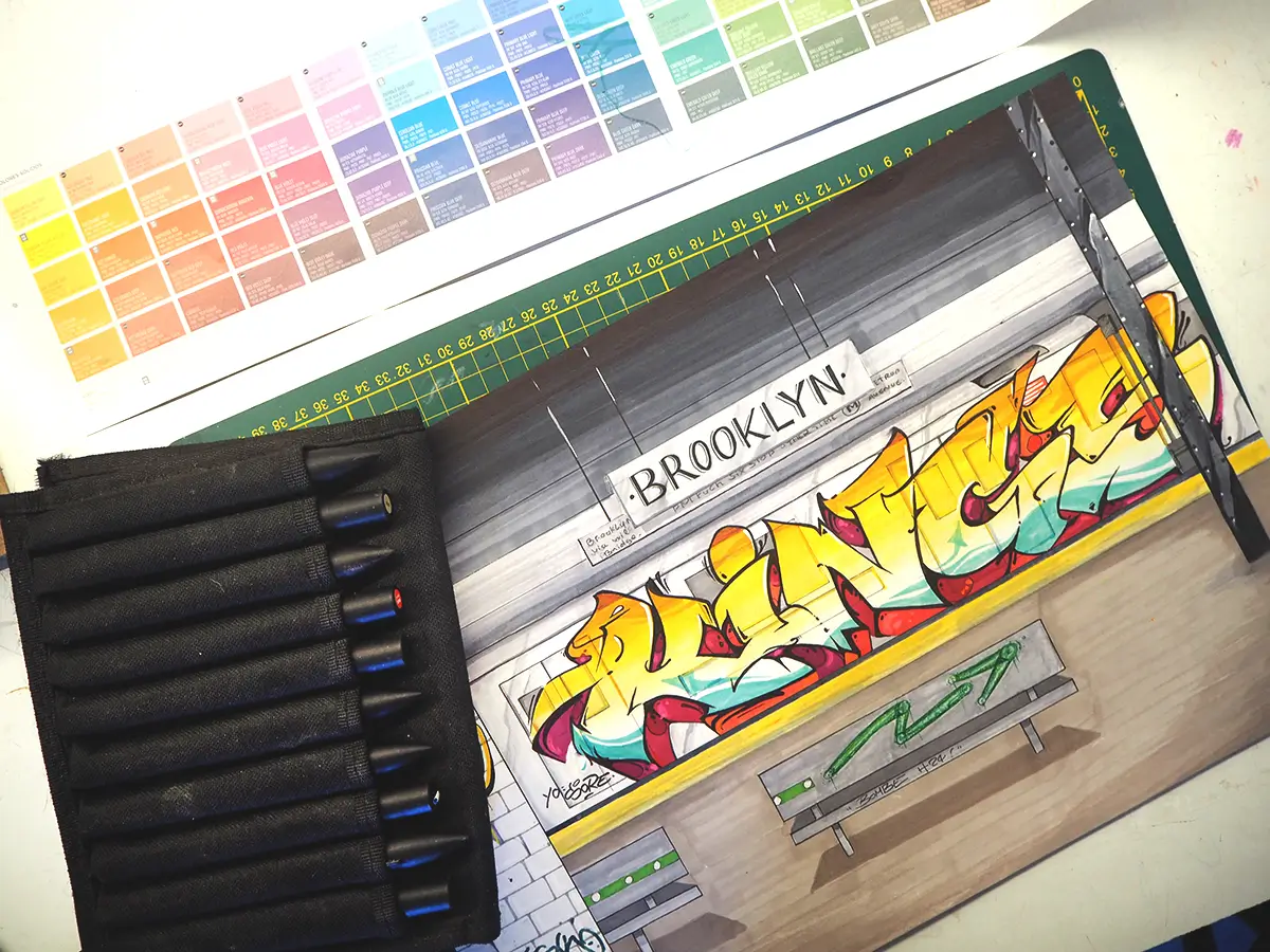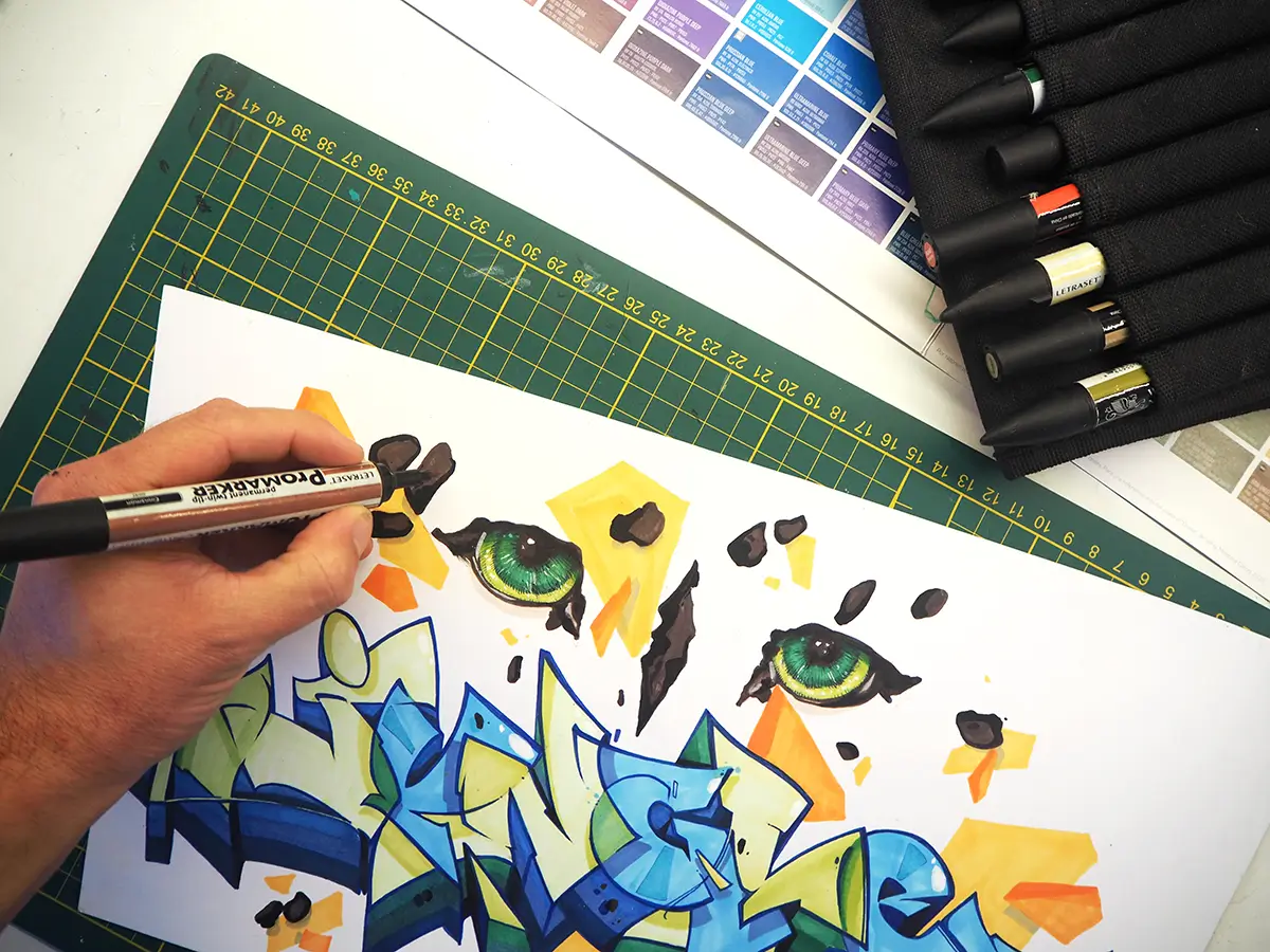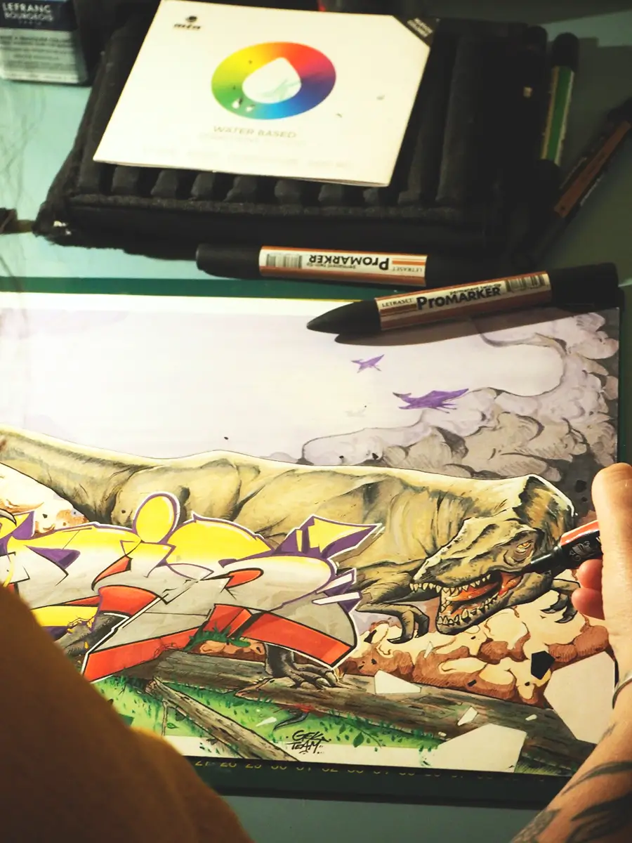 Les outils sont variés et adaptés à la pratique en atelier : bombes de peinture à base d’eau, encres, marqueurs acryliques et à eau (Posca, Promarker…), pour créer en toute liberté.