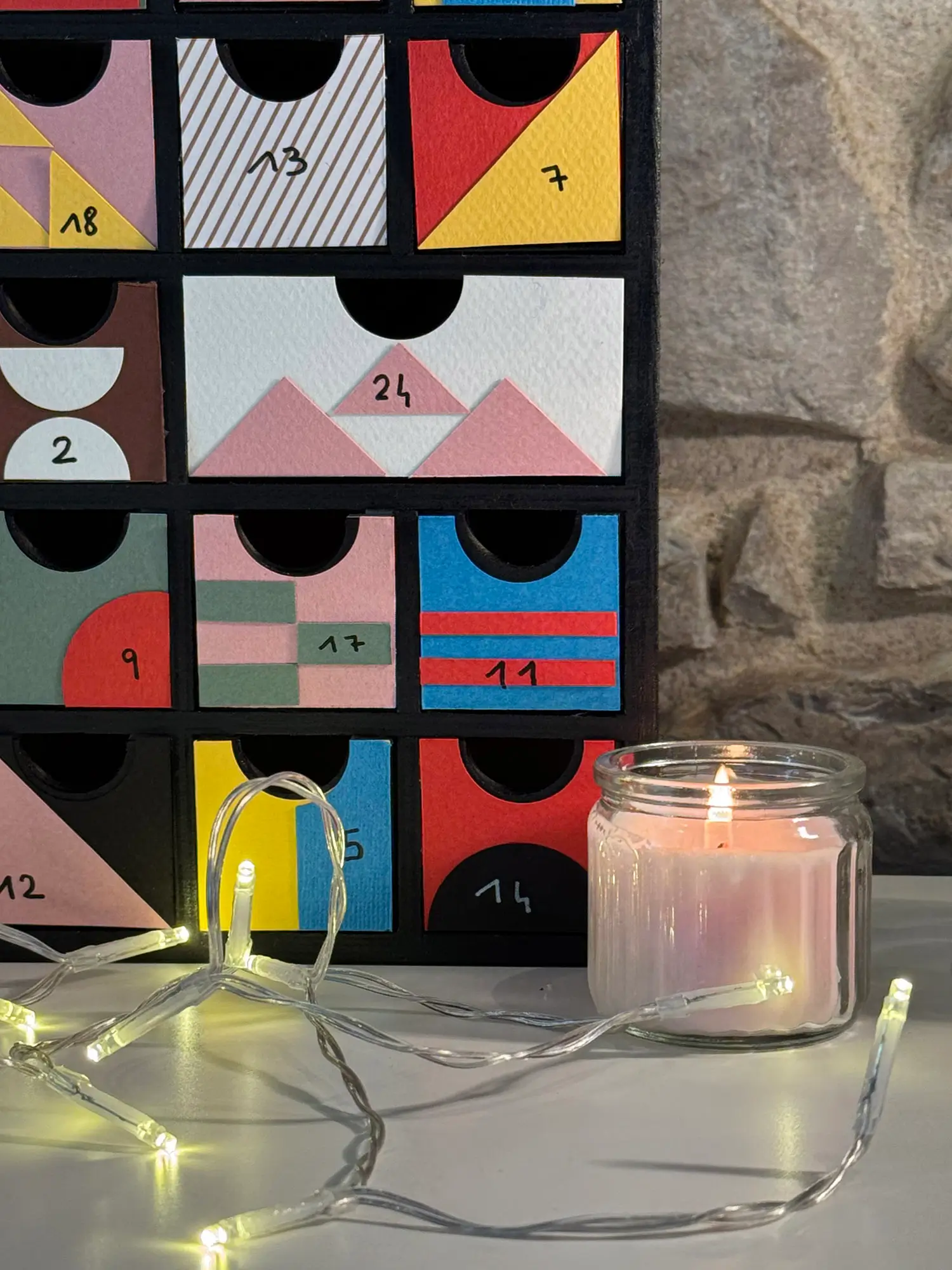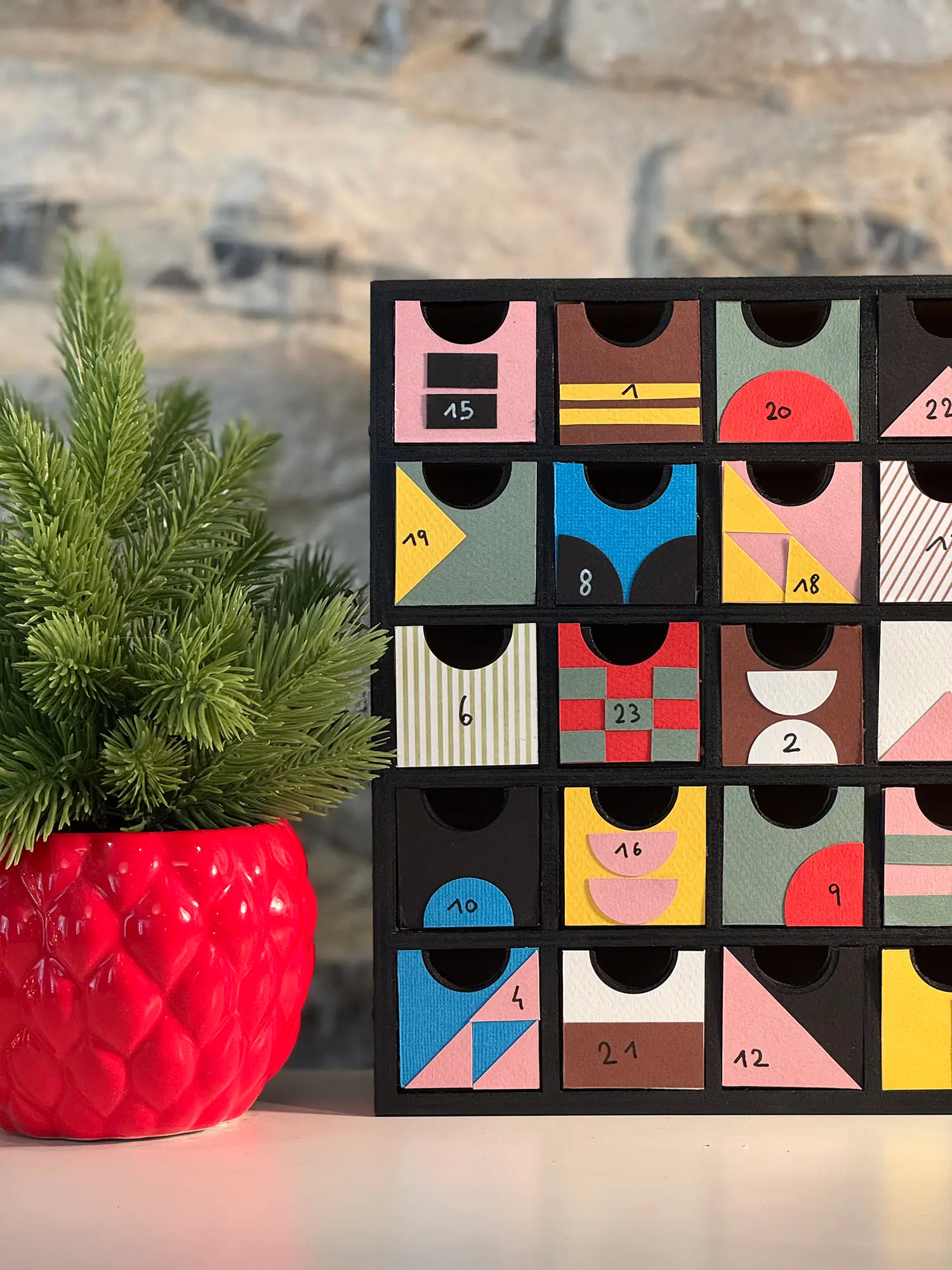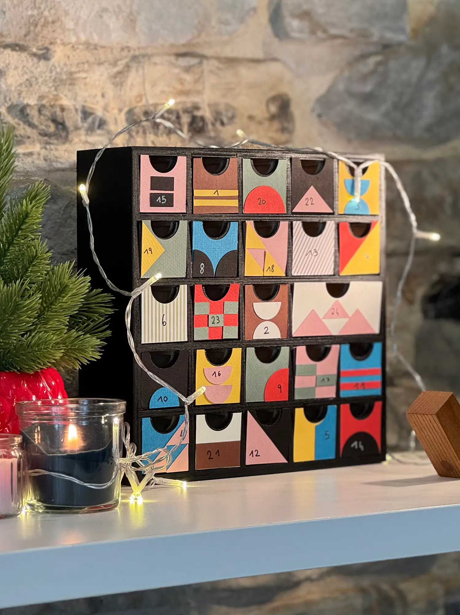 Cette année, nous avons voulu jouer la carte artistique à fond pour un calendrier de l’Avent original et coloré. Nous nous sommes inspirés du style Bauhaus, ce mouvement iconique du design qui mélange formes géométriques, couleurs vives et esprit minimaliste. Résultat : un Noël plein d’audace et de créativité !
