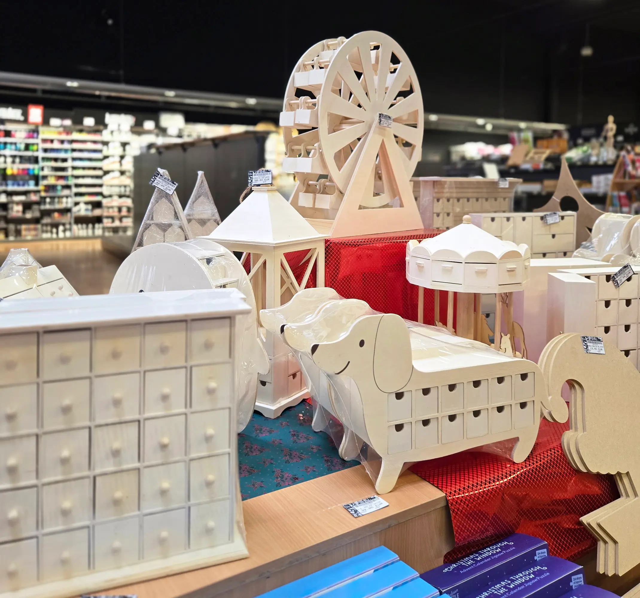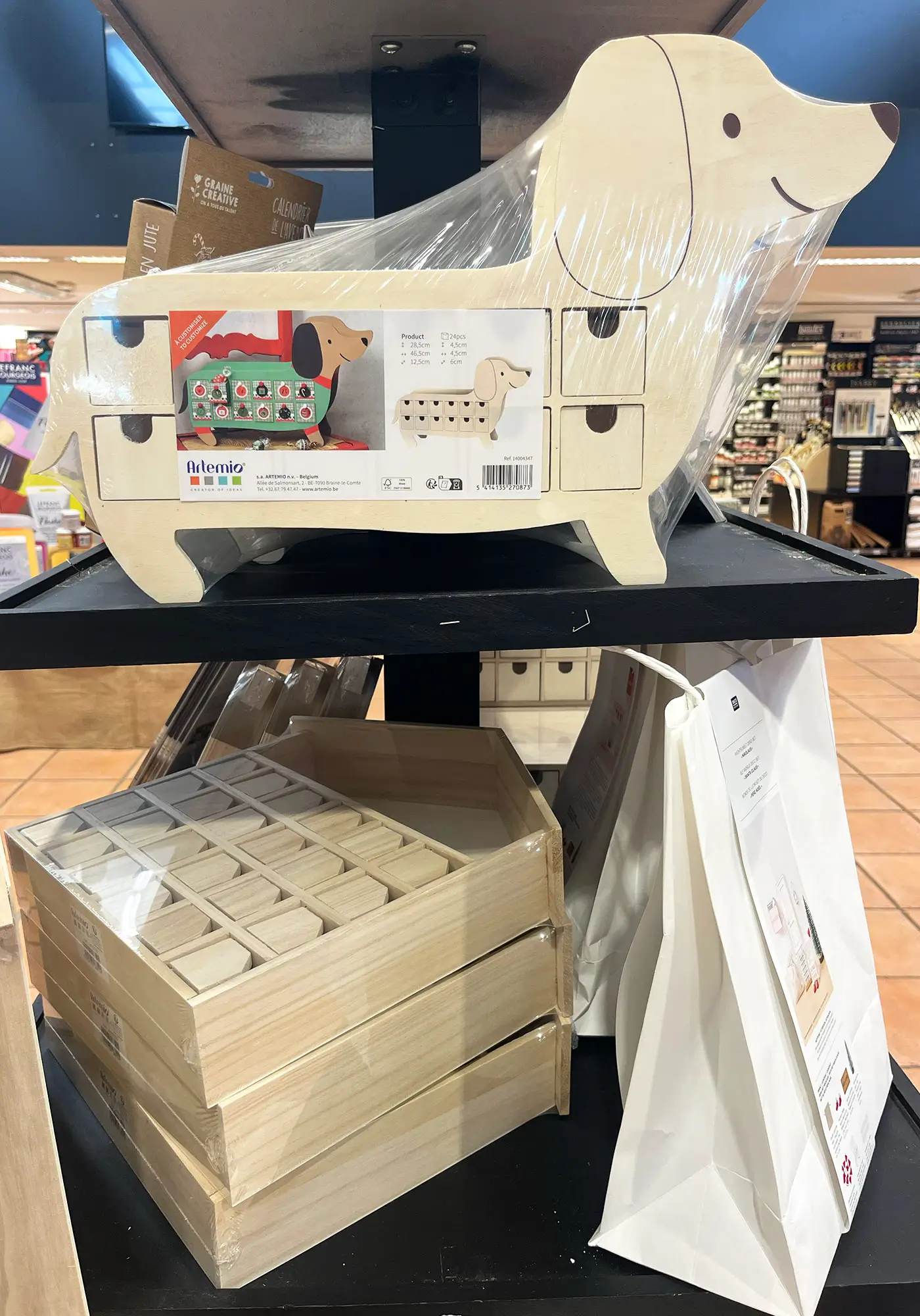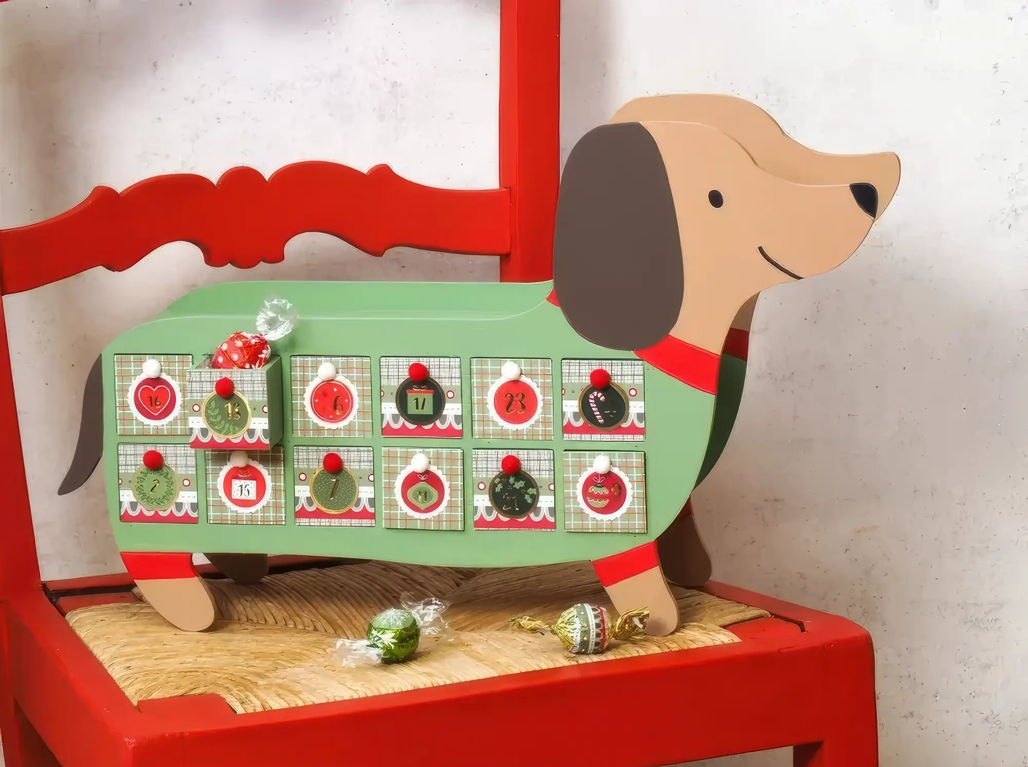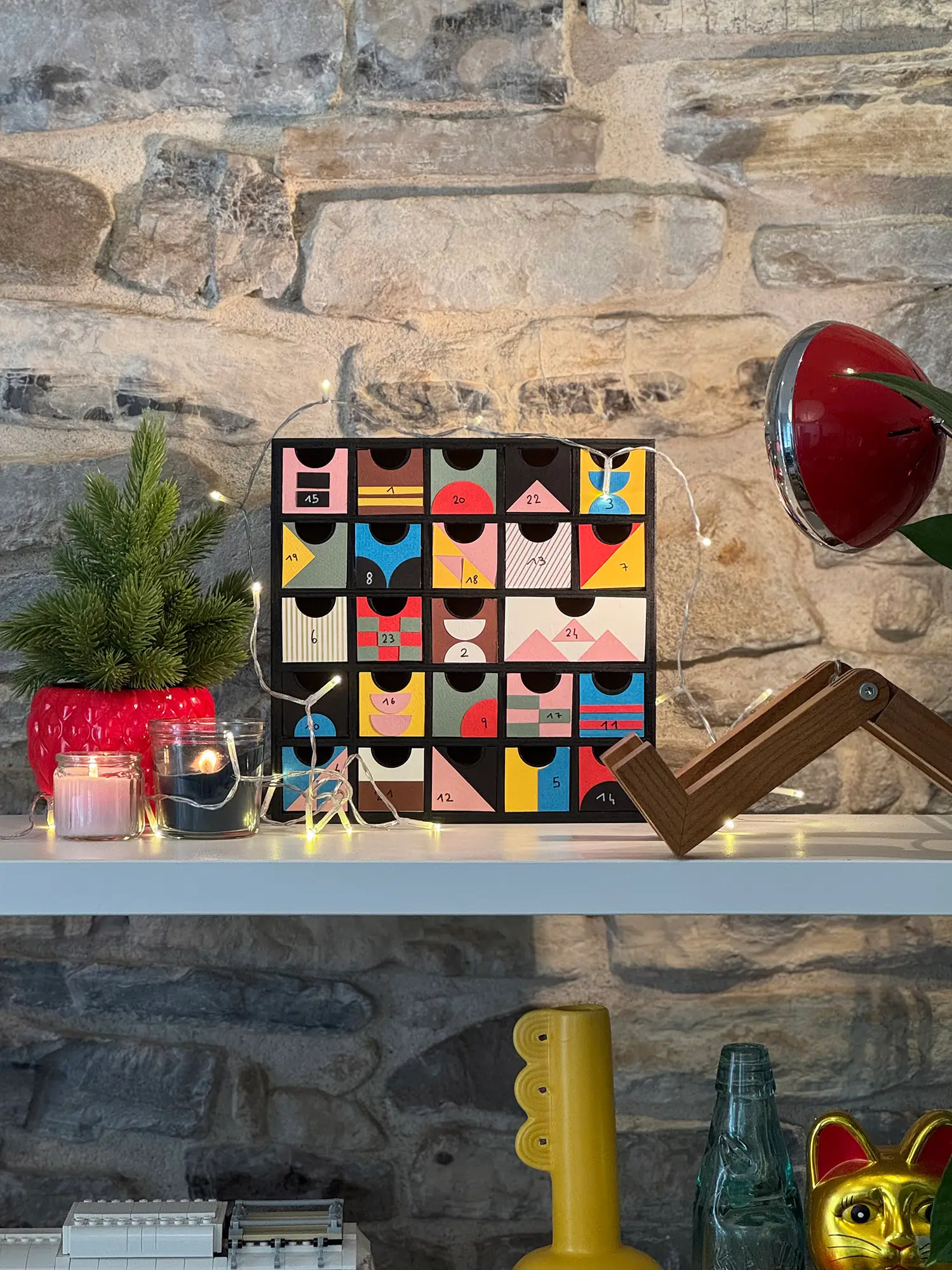 Cette année, nous avons voulu jouer la carte artistique à fond pour un calendrier de l’Avent original et coloré. Nous nous sommes inspirés du style Bauhaus, ce mouvement iconique du design qui mélange formes géométriques, couleurs vives et esprit minimaliste. Résultat : un Noël plein d’audace et de créativité !