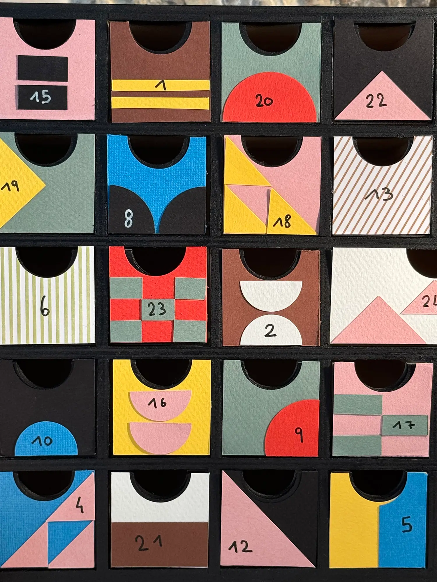 Réalisé uniquement en découpage et collage, notre calendrier de l’Avent 2025 reprend les codes de ce style graphique intemporel pour une déco de fête à la fois artistique, moderne et joyeuse. Une belle idée DIY pour celles et ceux qui rêvent d’un Noël design et coloré façon Bauhaus !